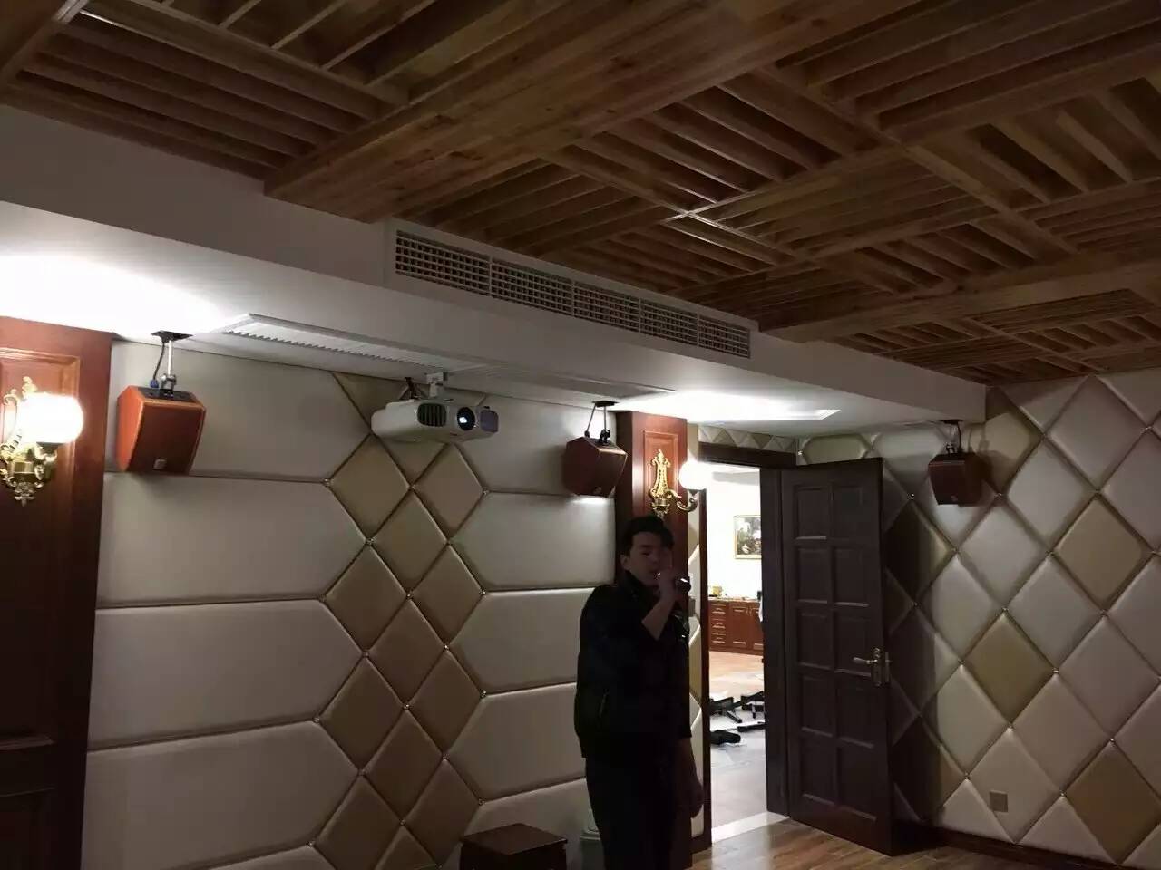 先根據聽音環境及沙發的布置確定音箱的位置,專業音響設備5.1系統包括左、右主擴音箱,中置音箱,左、右環繞音箱,低音炮。左右主擴安裝在電視機兩側;中置音箱放在中間,一般放在電視機下面;左右環繞在房間后場左右兩頭;低音炮位置無特殊要求,想要更勁爆的效果一般放在前面。