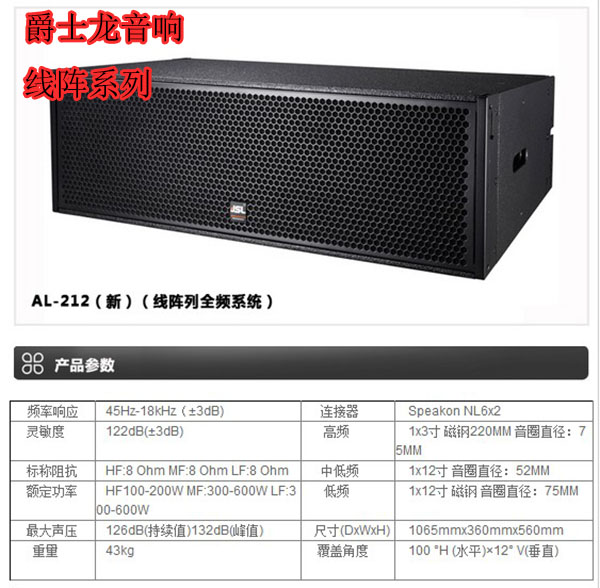 爵士龍廠家主營(yíng)舞臺(tái)燈光音響設(shè)備、俱樂(lè)部KTV音響設(shè)備、會(huì)議室音響設(shè)備、體育館音響設(shè)備等,是一家集產(chǎn)品研發(fā)生產(chǎn)、銷售、工程項(xiàng)目為一體的綜合性現(xiàn)代化企業(yè)。現(xiàn)在為大家介紹一款舞臺(tái)燈光音響設(shè)備線陣AL-212音箱: